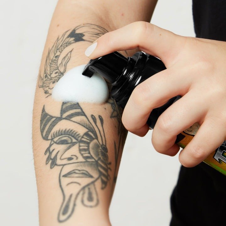Realizzata con ingredienti naturali tra cui miele vegano, lavanda e olio di chiodi di garofano, la schiuma antibatterica naturale di BIOTAT anestetizza la pelle tatuata di recente, riduce il rossore e l'infiammazione e rimuove facilmente l'inchiostro residuo dalla pelle.